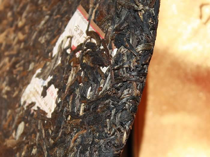 The cake is tightly compressed, well matured, yielding a mid-aged Pu-erh teas' delightful camphor aroma and intense aftertaste.