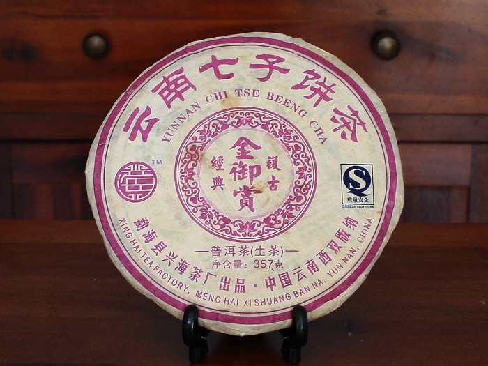 This is a limited supply of a mid-aged Pu-erh raw cake Jin Yu Shang (金御赏). The tea was produced by one of the well known Pu-erh tea factories in the Meng-Hai area, the Xing-Hai Tea Factory (兴海茶厂).