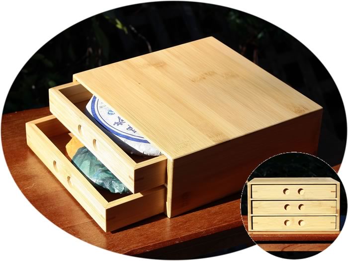 This is a bamboo Pu-erh tea storage unit with a drawers designed for the convenience of breaking, assessing and storing any compressed teas.