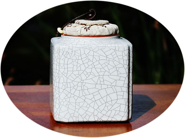 This is a medium size tea canister made of premium Ge Kiln ceramic with a classic 'Cicada's wings pattern' in the color of white. The canister is in a cube design, yet with curled corners for a soft and traditional appearance. The canister is sealed (semi-airtight) by a cork lid covered with traditional cotton fabric.